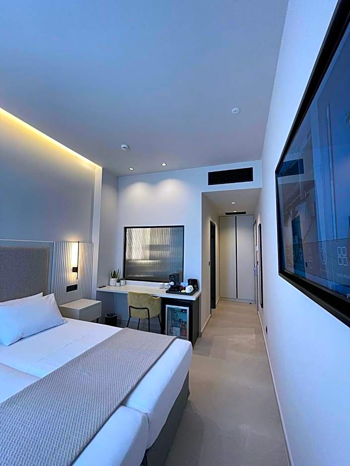 Luxurious room with queen-size bed, design fittings, espresso machine, natural Elaion products, and city view.